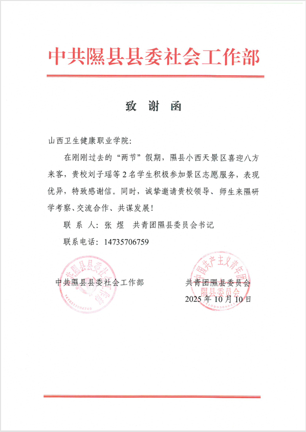 近日,隰县县委社会工作部、共青团隰县委员会向我院发来感谢信,对我院王雅洁、刘子瑶两位学生在国庆 、中秋“两节”期间积极参与景区志愿服务给予高度肯定与诚挚感谢。