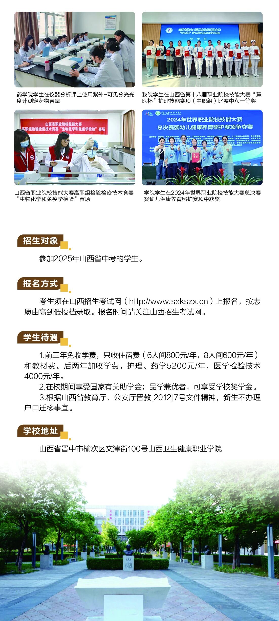 山西卫生健康职业学院简介山西卫生健康职业学院前身是创建于1953年8月的山西省卫生厅卫生人员训练班,2018年3月经山西省人民政府批准,国家教育部备案,正式改制为普通高等职业院校。学院是全国卫生职业院校执业资格考试联盟副理事长单位,全国护士执业资格考试工作委员会副主任委员单位,全国卫生职业院校信息化教学创新发展联盟理事单位,教育部首批“1+X”证书制度试点院校,山西省职业教育医药卫生专业教学指导委员会主任委员单位,山西省基层卫生人员培训基地,“山西护工”精准扶贫定点培训基地,山西省住院专科医师规范化培训和助理全科医生培训管理中心,山西省继续医学教育管理中心,全省仿制药一致性评价分析检测中心授权挂牌单位,山西省医药卫生健康职业教育集团(联盟)理事长单位。学院现有太原双东、晋中文津和晋中太谷三个校区,有山西省人民医院、太原市人民医院、太原市中西医结合医院、晋城市第二人民医院、山西盈康一生总医院、榆次区中医院等6所附属医院,有北京协和医院、战略支援部队特色医学中心、航天中心医院、应急总医院、天津泰达国际心血管病医院、山西医科大学第一医院及第二医院、山西省肿瘤医院、山西省中医院、恒伦口腔医院、山西顺天立大健康产业集团等一百多个稳定的实习就业基地。开设有21个专业,在校生一万多人,其中护理和药学专业为山西省高职“百强骨干”专业和高水平重点专业建设项目;医学检验技术、药学专业为山西省职业教育品牌专业“十四五”第一批建设项目;护理专业为山西省职业教育品牌专业“十四五”第二批建设项目;药学、助产、口腔医学技术专业为山西省职业教育重点专业建设项目;医学检验技术、护理、医学影像技术专业为山西省职业教育重点实训基地建设项目。建校70多年来,学院始终秉承“厚德、博学、慎独、远志”的校 训精神,为各级各类医疗卫生机构培养了以全国首枚“白求恩”奖章获得者、“人民的好医生”赵雪芳和全国中医界首枚“白求恩”奖章 获得者、全国道德模范、全国中医药杰出贡献奖获得者王学诗为代表的医药卫生人才15余万名,为推动我省医药卫生事业发展做出了重要贡献。学院将继续为全方位推进山西高质量转型发展,服务“健康山西”的宏伟目标发挥更大作用,为把学院建设成为国内知名、省内一流的高水平卫生健康职业院校而努力奋斗!